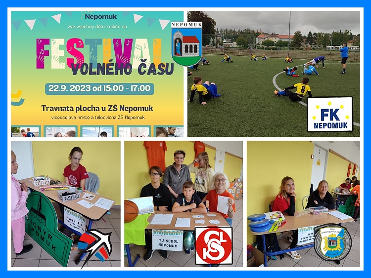 V pátek 22.9.2023 proběhl v areálu Základní školy a přilehlých sportovištích Festival volného času, na kterém se prezentovali koordinátoři spolků, organizací a lektoři z Nepomuku, pořádající kroužky, kurzy a akce pro děti. Každý ze zúčastněných si připravil vlastní program, který vystihuje jeho činnost s dětmi. Rodiče i děti se mohli dozvědět na jaký kroužek, kurz či akci dítě přihlásit a osobně se seznámit se samotnými vedoucími. Pro návštěvníky bylo připraveno bohaté občerstvení, odměny pro děti a vystoupení kejklířů. Festival navštívila paní Bc. Vlasta Faiferlíková, předsedkyně Regionálního dobrovolnického centra Plzeňského kraje, která zde prezentovala dobrovolnickou činnost v Plzeňském kraji. Návštěvníci festivalu měli také možnost se seznámit s ukázkami činností Klubu Magnet pro děti a mládež v jeho mobilní podobě s automobilem „Máňa“.Na akci byl představen přehled Volnočasových aktivit pro děti a mladistvé v Nepomuku na školní rok 2023/2024, který naleznete na webových stránkách města a Volnočasového centra Fénix.Město Nepomuk se chystá odměnit osobnost, která se dlouhodobě aktivně věnuje práci pro děti a mladistvé. Anketa probíhala již během festivalu a bude pokračovat do konce listopadu 2023. Hlasovat můžete osobně nebo elektronicky na webu města.Děkujeme všem zúčastněným a těšíme se na další spolupráci!