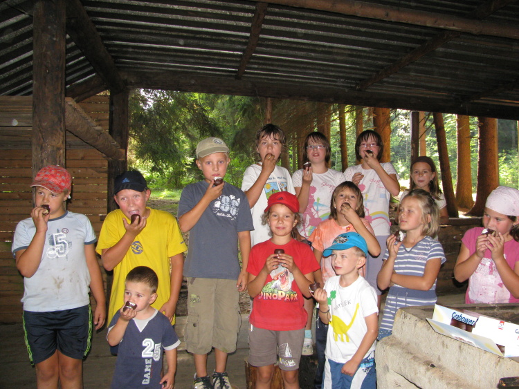 V pátek jsme  opekli na táboráčku buřtíky.  Pepa čaroval nad ohněm. Nočním Přebudovem proběhl i roj svítících světlušek. Projekce fotek z tábora měla velký ohlas. V noci byla trochu zima, ale sobota to vynahradila bylo přímo nádherně sluníčkově. Poklízeli jsme a rovnali věci na táboře. Dopolední vycházka okolo rybníka měla podtext Rozloučení s kachnami. Na rybníku jsme napočítali  osmdesát kachen. V lese jsme soutěžili a stavěli domečky. Naše  počínání přerušili myslivci, kteří přijeli  na rybník  vyvraždit naše kachničky, které nám dělaly celé prázdniny společnost. Ran bylo určitě víc jak kachen. Cestou lesem jsme zkusili odvahu vylézt na myslivecký posed a potkali jsme také stádo kraviček. Odpolední vycházka byla do indiánského tábora, kde jsme zajali několik indiánů a s chutí jsme je snědli. K večeru byla diskotéka. Nedělní ráno nás přivítalo kapičkami deště, ale to už jsme odjížděli domů a těšíme se opět na červnový táborový nulťák 2012.
