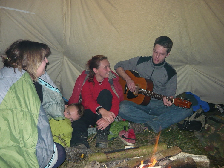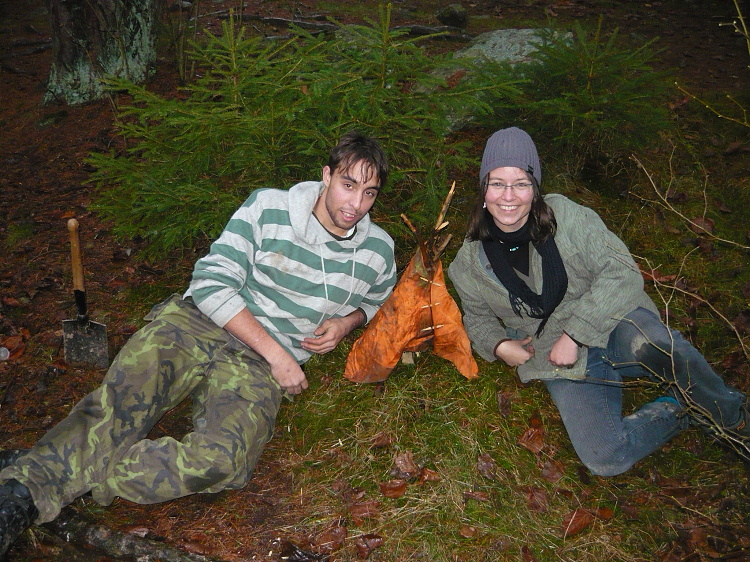 Letos jsme se rozhodli, že pro naše mladší postavíme Medvěda u sousedů archeologů, aby si užili táboření v „zimě“. Nepředpokládali jsme, po vzoru let uplynulých, že by napadl sníh, ale teplota pod patnáct stupňů také není k zahození. Na místě jsme se scházeli postupně a i proto jsme stavěli už za tmy a dříví dělali také za svitu čelovek. První večer jsme strávili konzumací vybraných lahůdek, povídáním a zpěvem. Protože jsme se zase dlouho neviděli, tak jsme povídáním strávili velikou část noci. Ráno, po snídani, se vylosované dvojice zúčastnily sobotní soutěže. Prvním úkolem bylo sesbírat co nejvíce lístečků s čísly. Byly poschovávané doopravdy všude. Po přinesení a vyhodnocení si dvojice vylosovaly deset čísel z přinesených, vylosovali si matematická znaménka a začali počítat, aby dostali co největší výsledek. Po tomto kole jsme se sebrali a vyrazili na inspekční cestu na naší táborovou základnu. Cestou u Indiánů jsme si opět zasoutěžili. Tentokrát zaplanulo několik ohňů na čas. Napřed bylo slyšet pouze lámání větví, ale potom, když všechno utichlo, bylo slyšet pouze škrtání sirek a sakrování, protože tak trochu foukal vítr. Na základně bylo vše v pořádku, prošli jsme se po rybníku a oklikou se vrátili do týpka, kde jsme se naobědvali. Po obědě, pravda trochu pozdním, byla vyhlášena poslední soutěž. Každá dvojice měla za úkol vytvořit nějaké umělecké dílo. Minitee-pee a minilodička byly velmi povedené a stav zůstal nerozhodný. Nicméně byly vyhlášeny výsledky, rozdány ceny a vypravili jsme se do Budislavic, rozloučili se s kamarády a podívali se na Budislavické čerty. Kamarádi jeli do Plzně na maturák, ze kterého se vrátili jiní v noci, když už je nikdo ani nečekal. ¨ Ráno jsme vše zabalili, nalodili do auta a odvezli se do Nepomuku, kde jsme se všichni rozloučili a rozešli do svých domovů. Mejla