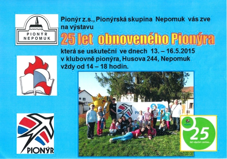 Pionýrská skupina v Nepomuku ve dnech 13. – 16 .5 .2015 v rámci oslav 25. výročí obnoveného Pionýra připravila výstavu dvacet pět let činnosti této organizace v Nepomuku. Na 150 tablech plných fotografií byla od roku 1990 zdokumentovaná každoroční činnost této dětské organizace.  Každý rok měl svoje tablo, kde byly fotografie z akcí, soutěží a her. Svoje místo zde měly i fotografie z pionýrských táborů v Přebudově a dalších míst, kde naše skupina tábory pořádala. Vystaveno bylo i 256 výrobků dětí, které zejména vytvořily děti z oddílu Pusík a Knoflíci za posledních pět let. Byl zde i narozeninový dort ozdobený dvaceti pěti dárky vytvořených od ledna v rámci akce „25 dárků k 25. výročí Pionýra“.  Bylo vystaveno 153 rekvizit zejména z táborů přibližující náměty celotáborových her. Mezi ně patřila i naše „Pohádková půda“, kdy byly vystaveny kulisy z tábora rodičů s dětmi. Zájem byl i o táborové hrnečky a trička, které zde měl druhý běh tábora. Svoje místo zde měly výroční zprávy a kroniky, kterých bylo 32 a také 14 plaket a pohárů skupiny. Návštěvníci oceňovali rozsáhlost, pestrost a zajímavosti naší výstavy. V anketním lístku nám dávali samé jedničky.