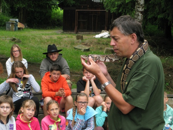 nebezpečí a vesele se kloužeme po skluzavce a řádíme v pěně. Ale záhy se vracíme zpět na cvičiště. Posilujeme svaly v silácké olympiádě a měříme síly se sousedním táborem v šiškované. A protože základem je znát svého soupeře, tak nás o nebezpečných tvorech přijíždí poučit Martin Vobruba z Plzeňské ZOO. A když si k tomu ještě postavíme pevné přístřešky, do kterých se vejdou i ti největší