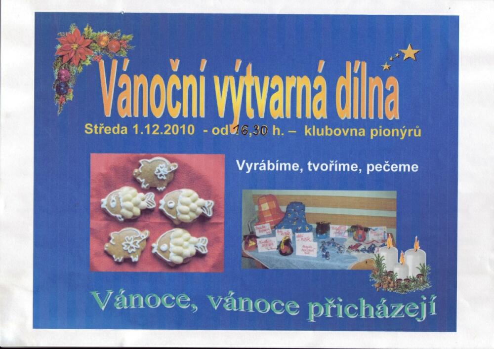 Ve všech klubovnách v pionýrském domě se tvořilo. Pekly se a zdobily vánoční perníčky. Dekorovaly se vánočním motivem svíčky. Děti skládaly vánoční ubrousky a krabičky. Vyráběly také postavičky do Betlému a nazdobily vánoční stromeček.