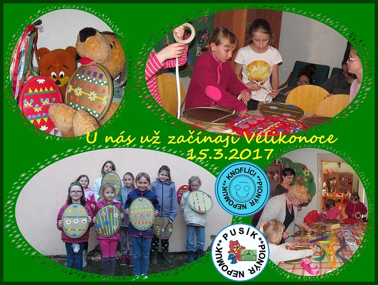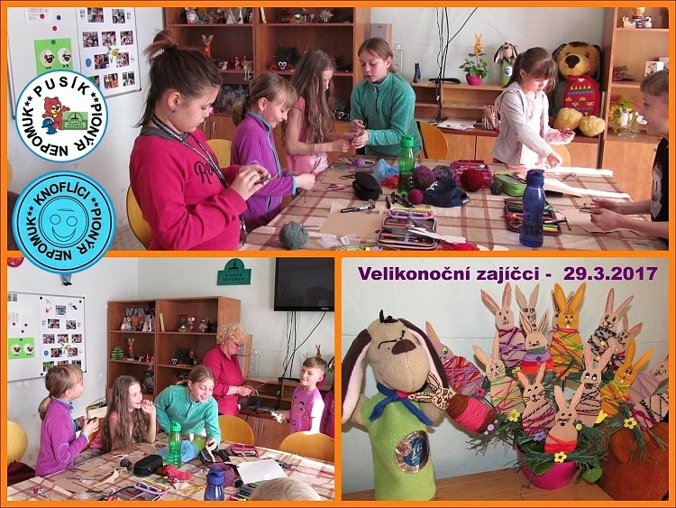 Letos jsou Velikonoce až v dubnu, ale naše oddíly Pusík a Knoflíci tvoří již jarně. Připravují velikonoční louku na naší výstavku. Vytvořili jsme kraslice XXL, beránky, kohoutky a zajíčky. Maminkám jsme také udělali pěkný zápich k MDŽ s kytičkou. Podívejte se na naše stránky oddílu Pusík.