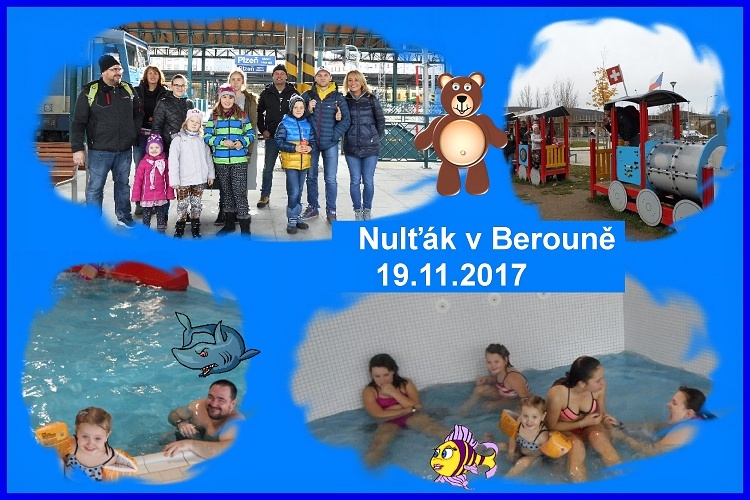 V neděli 19.11.2017 ráno jsme se sešli na Nepomuckém nádraží. Bohužel náš rychlík se zasekl někde v Číčenicích a nestihli bychom další vlak z Plzně do Berouna. Naskákali jsme do aut a vyrazili směr Plzeň. Ta je samozřejmě rozkopaná a tak nám rychlík ujel. Naštěstí jel půl hoďky po něm courák. Cestou jsme se nasvačili a poklábosili, uteklo to jako voda i když jsme měli samozřejmě zpoždění. Jak řekl průvodčí. Výluka je, autobusem nepojedete, ale na čas rozhodně nepřijedeme. ČESKÉ DRÁHY to je podnik!. Medvědy jsme vypustili a šli rovnou do bazénu. Bazén byl super. Hlavně skluzavky a tobogány. Všichni jsme si to užili a vydali se na zpáteční vlak. Tentokrát jel přesně, bohužel ne ve tři, ale za deset minut tři. Na nádraží jsme došli ve 14 52. Naštěstí umí Verča zastavit vlak. Je dost statečná. Všichni jsme doběhli a mohlo se jet. Ve vlaku byla švanda nebylo totiž místo pro takovou skupinu a tak jsme postávali v uličce i v kupéčkách a cestu nám zpříjemňovali i průvodčí a Policie, která zrovna v tomto rychlíku někoho hledala. Byla to legrace. V Plzni jsme se rozloučili a rozešli ke svým autům a jeli domů. Akce splnila účel. Těšíme se na další.*Martin