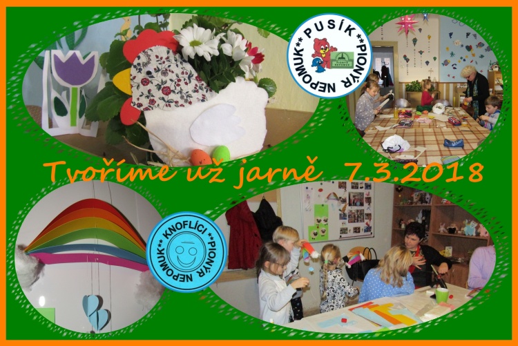 Naše jarní a velikonoční tvoření u oddílu Pusík a Knoflíci začalo 7.3.2018 a letošním naším hitem byly slepičky a zajíčci. Připravili jsem také "Velikonoční výtvarnou dílnu pro dospěláky" a odpoledne "Hledání velikonočního zajíčka". Podívejte se na naše fotografie.