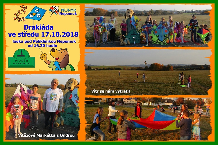 Ve středu 17.10.2018 připravili Pusíkovci již tradiční Nepomuckou drakiádu. Na louce u školy to však byl spíš běhací než lítací den. Vítr nám letos nepřál. Děti se však rády proběhly. Vítězem byl plamenný pták Markétky a Ondry a získali putovní pohár naší drakiády.Na rozfoukání větru jsme použili naše padáky a soutěže s nimi. Sladkou odněnou za účast na naší akci byla asi již poslední zmrzlina z nedalekého stánku z Opočna.*MD
