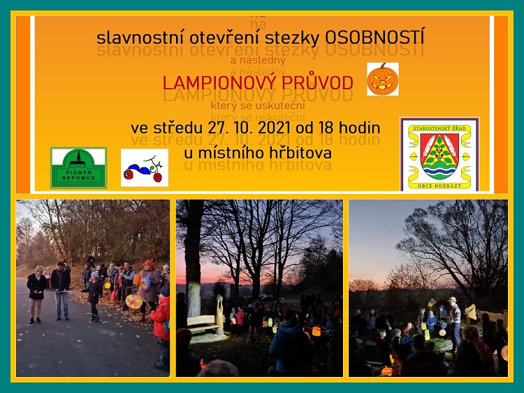 Po roční pauze tradice opět oživena. Přes 200 účastníků se sešlo u místního hřbitova 27. 10. 2021, aby společně oslavili vznik samostatného československého státu, slavnostně otevřeli stezku osobností a pak tuto stezku prošli s lampiónky. Trasa byla označena svíčkami a různými světýlky. Byl nádherný pohled na lampionového hada, který se zastavil u každé lavičky, kde dětmi byla představena osobnost, které lavička je věnována. Celkově akce měla probíhat jako oživlá historie, ale i naše pomocníky postihla karanténa a v den lampionového průvodu, oznámil „sv. Martin“, že je v karanténě. Našlo se super řešení a zdravice s představením patrona obce Neurazy proběhla online pomocí reproduktoru, který byl využit u dalších postav při různých citátech. Z tohoto řešení jsme byli opravdu nadšeni a máme nový směr, jak pokračovat v naší tradici lampionových průvodů. Cíl u rybníka Rousovák neměl chybu a každé dítě dostalo buřta a čaj volně k dispozici. Na pořadatele už buřty nezbyly, účast byla opravdu nevídaná. Tak zase někdy v Neurazech.**Marie Svejkovská