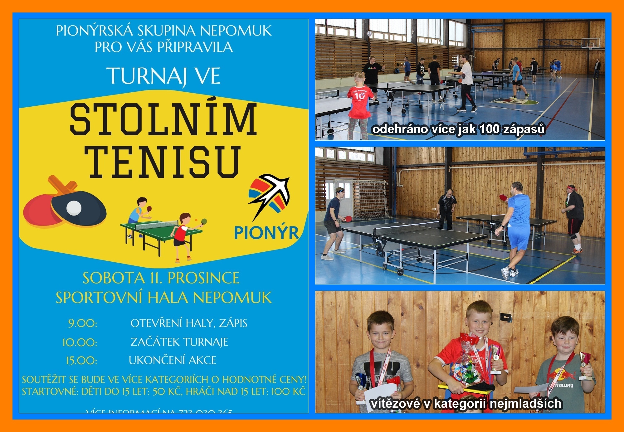 Doufáme, že si všichni účastníci turnaj užili a že se spolu brzy uvidíme na dalším.   V sobotu 11. prosince se uskutečnil Vánoční turnaj ve stolním tenise pořádaný Pionýrskou skupinou Nepomuk. Tento turnaj se odehrál ve Sportovní hale města Nepomuk a zúčastnilo se jej třicet hráčů, kteří se proti sobě utkali ve čtyřech různých kategoriích. Každý hráč si pak z tohoto turnaje mohl odnést nejen vánoční atmosféru, sportovní výkony, ale také odměny.