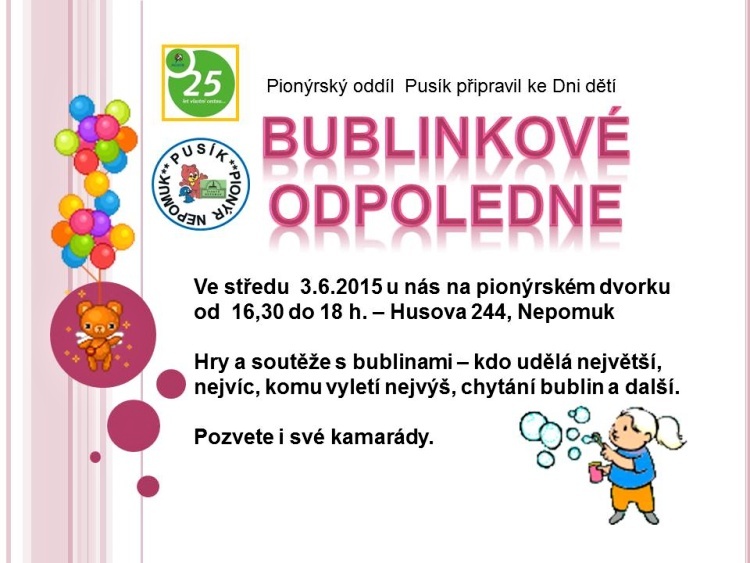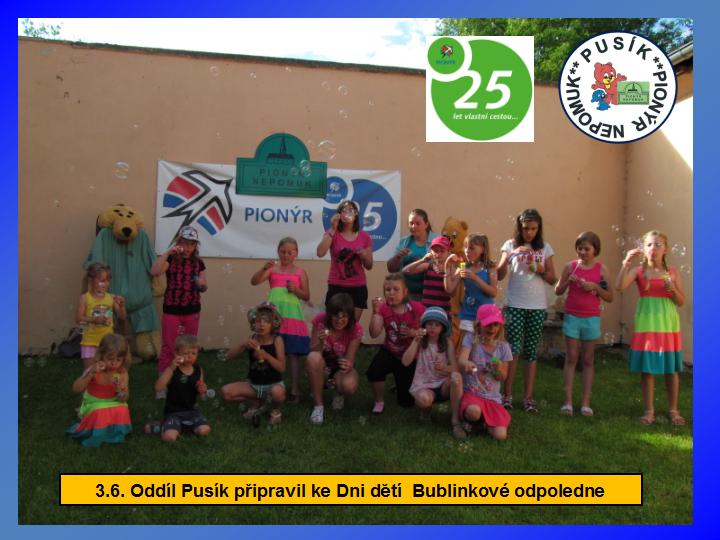 Naše dětská organizace Pionýr připravuje a organizuje volný čas dětem a dospělákům v malém městečku jižně od Plzně.